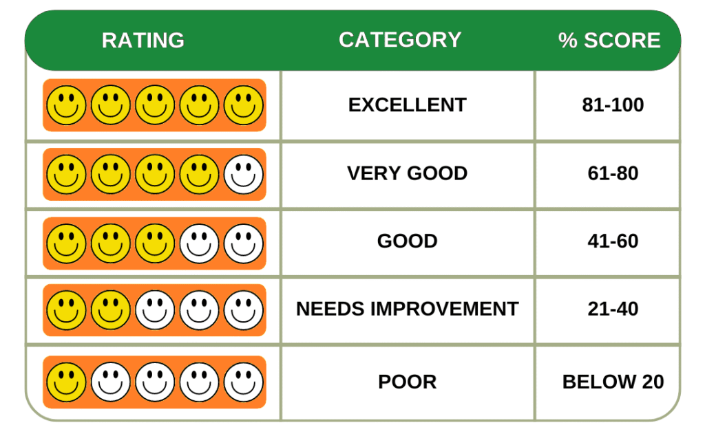 Refer to the table below to find out the Hygiene Rating for the percent score awarded by the Hygiene Rating Auditor: